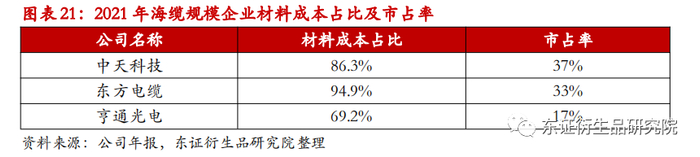 海缆行业成本原材料占比高达85%以上,利润空间受原材料价格变化直接影响。我们选取三家规模海缆企业,中天科技,东方电缆,亨通光电的海缆业务材料成本占比,根据市占率做加权平均后,得到海缆行业原材料占比为86.2%。