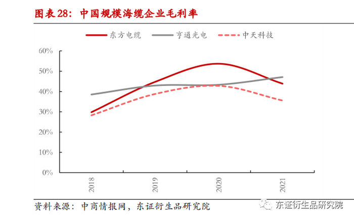 海缆敷设难度大,因此具有很强的属地优势。例如东方电缆在广东省投放了产能,在广东省中标的属地优势明显。目前国内只有中天科技,东方电缆,亨通光电三家公司有能力生产220V以上的海缆。三家公司均采用“研发设计,生产制造,安装服务”的模式为客户提供定制化产品,提供EPC总包服务及系统解决方案。目前三家企业毛利率均在40%左右,具有较强的盈利能力,市场竞争格局相对较为稳定。
