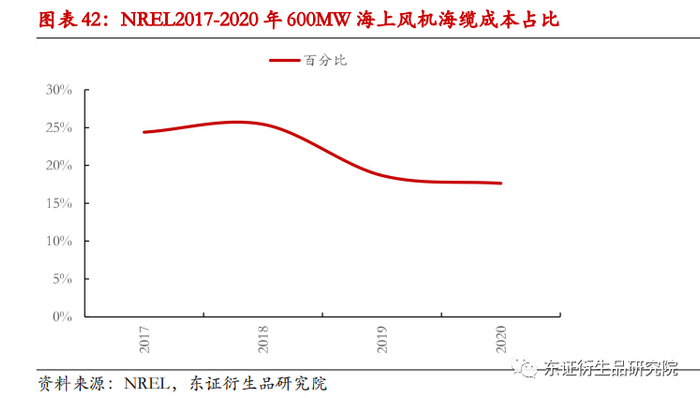 由NREL机构对600MW海上风电项目成本拆分可知,海缆在海外占比更高,约占18%左右。