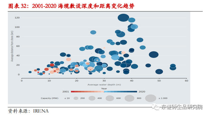 海上风电逐渐向深海远海迈进,一方面远海深海的风力资源较为丰富稳定,有助于海风降本增效;另一方面,近海风电制约因素较多,开发能力有限,深海远海蕴藏着更大的开发空间。根据IRENA的数据,2001年投入使用的海上风力发电场距离海岸约5公里,水深7米。2020年,海上风电场与海岸的加权平均距离和水深分别为30公里和38米。