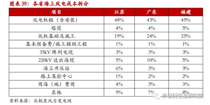 为了计算国内海缆的市场规模,我们对江苏、广东和福建地区的海上风电项目进行成本拆分。其中,风电机组(含安装)和施工占比最高,占比65-70%左右。江苏和福建海缆成本占比约为8%,广东约为13%,我们认为全国海上风电项目海缆成本平均占比10%。