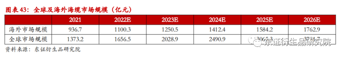 我们认为,欧洲的海缆占比将继续下降,预计每年下降0.5%,2026年将达到16%。我们用欧洲的海缆成本占比近似计算全球及海外海缆的市场规模,2026年全球海缆市场有望达到3781.7亿元。