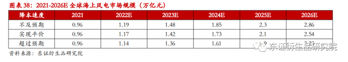 2021年全球海上风电市场规模约为0.96万亿元,根据模型测算,2026年全球海上风电的市场规模将达到2.54万亿元,CAGR21.48%。若海风降本速度超过预期,2026年市场规模将达到2.23万亿元,CAGR18.36%。