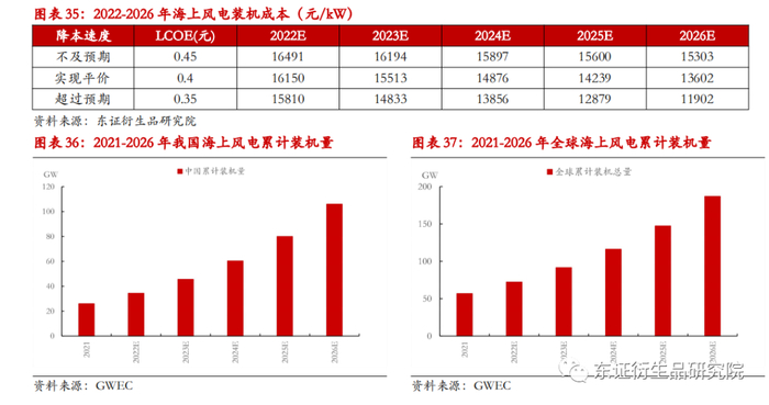 我们假设海上风电风机运行周期为20年,年等效满负荷小时数3000h,IRR为7%,上网电价0.4元/kWh。以2026年海上风电达到平价为基准,预测2022-2026年每年海风装机成本。