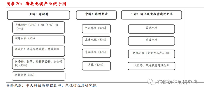 海缆产业链由上游的原材料金属(铜,铝,钢,铅等),非金属(绝缘材料,护套等),中游的海缆制造企业(中天科技、亨通光电、东方海缆等),以及下游海上风电投资建设企业构成。在上游原材料中,金属铜占比最高,约占70%。