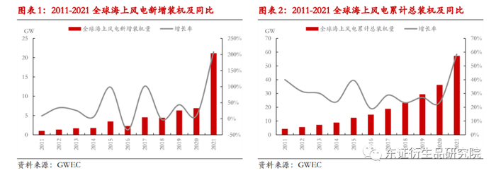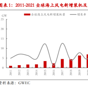 近几年,全球海上风电的装机量持续增长,根据 GWEC数据统计,2021年全球海上风电新增装机量21.1GW,创造了历史记录,全球海上风电装机总容量达到57.2 GW。可以预计,在碳中和背景下,海上风电将成为未来低碳发展的主线之一。