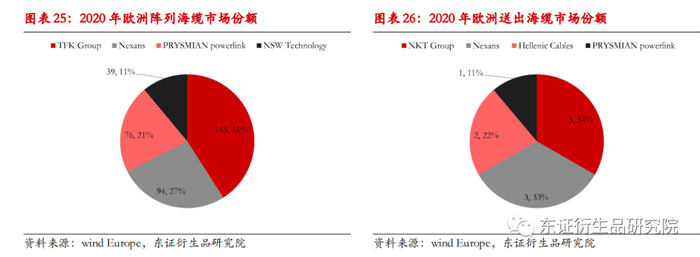 欧洲的海缆市场,2020年欧洲4家公司供应了集电海缆。TFK Group继续成为集电海缆(41%)的主要供应商,在德国、葡萄牙、比利时和英国拥有145根电缆。Nexans位居第二(27%),负责Borssele 1&2的涡轮机连接。PRYSMIAN排名第三(21%),其在Borssele 3&4的涡轮机连接。NSW Technology排名第四(11%)。