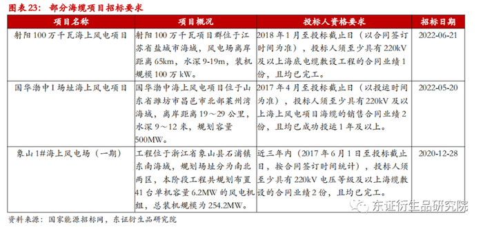 业绩资质壁垒:海缆敷设属于重大工程,在项目招投标阶段,海缆企业的过往业绩和安装经验是下游客户重要的考察部分,近两年的海上风电项目招标时普遍对企业过往三年内有项目经验要求。同时海缆企业产品需要通过CCC认证,认证周期长达一年。海缆项目的历史业绩要求较高且资质认证周期较长,对于新进入玩家来说,很难与现有规模企业形成竞争。