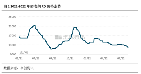 【导语】 7月份后防老剂RD(TMQ)再次进入下行通道,累计跌幅在9.1%,那么防老剂RD价格此次下跌的主要推动因素是什么?短期原料价格变化及供需面的变化,将对防老剂RD后期价格走势产生哪些影响?下面卓创资讯将进行具体分析。