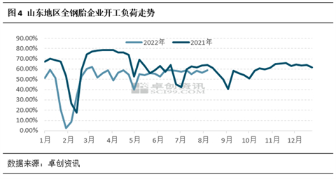 上图为卓创资讯监测的26家山东地区全钢胎样本企业的开工负荷走势,其在7月中旬后的开工负荷偏低,截止到8月12日,平均开工负荷为57.6%,同比下滑4.8个百分点。轮胎装置的低负荷拉低了防老剂的整体需求。