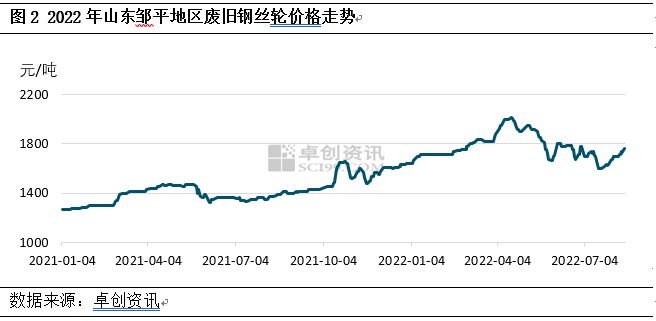 2022年上半年,山东邹平地区900以上废钢丝胎市场呈现先涨后跌的运行态势。1-4月废旧钢丝胎货紧价扬的助力下,废胎价格涨势喜人,一路高歌实现新的突破,尤其在4月中旬涨至上半年峰值,日均价2015元/吨附近。然而好景不长,区域加工利用市场表现持续弱势,原料及加工品交投平淡,废钢丝胎价格终究抵不过需求的拖累而震荡下行,在5月底日均价跌至1665元/吨左右,较峰值降幅17.4%。随后相关产品市场行情震荡上行较强带动以及轮胎裂解争夺废胎货源而导致废胎货源愈加紧俏下,废胎价格“身价”再次被抬升,截至8月15日,废胎价格到厂1760元/吨左右,较前期低值涨幅5.7%,较今年峰值降幅12.7%。总的来看,今年山东邹平地区900以上废钢丝胎市场在下行过程中并不顺畅,价格反弹时有发生。