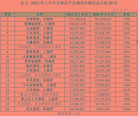 在上半年全球各类期货期权品种成交量排名中,中国品种在农产品品种前20名中占有16席,包括豆粕、棕榈油、豆油、玉米、菜粕、白糖、纸浆、天然橡胶、菜籽油、棉花、豆粕期权、苹果、玉米淀粉、玉米期权、黄大豆1号、花生。