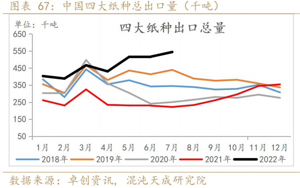 7月文化用纸出口明显增加,预计和能源价格高企,国内成品纸价格仍较低有关,利好国内成品纸出口有关。