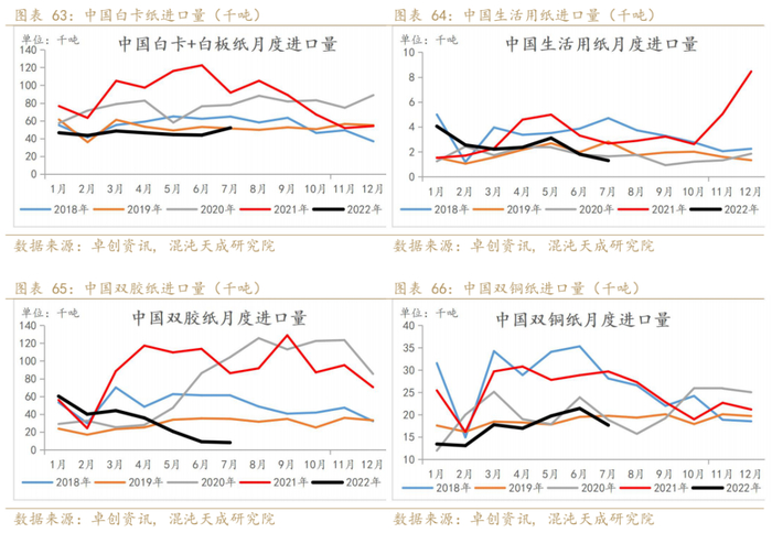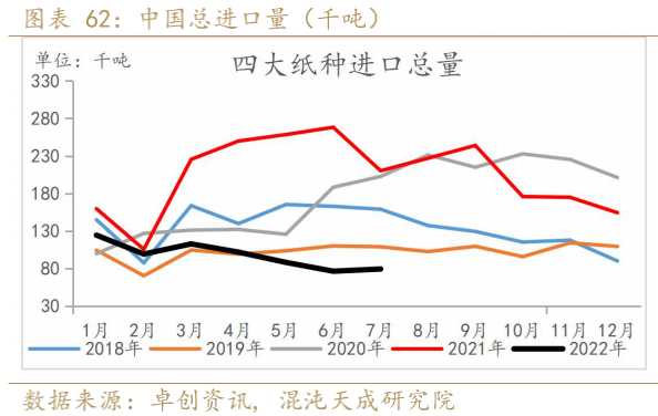 2022年7月四大纸种进口仍处于近几年低位。