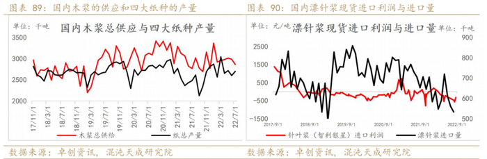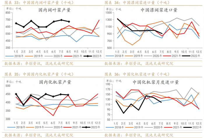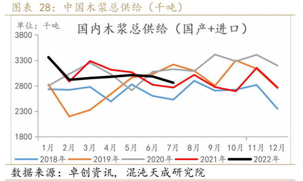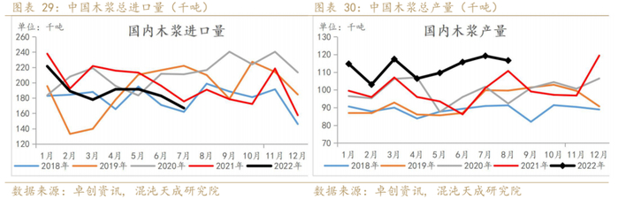 22年1-8月国内木浆产量累计同比增加15%,1-7月木浆进口量累计同比下降9.1%。