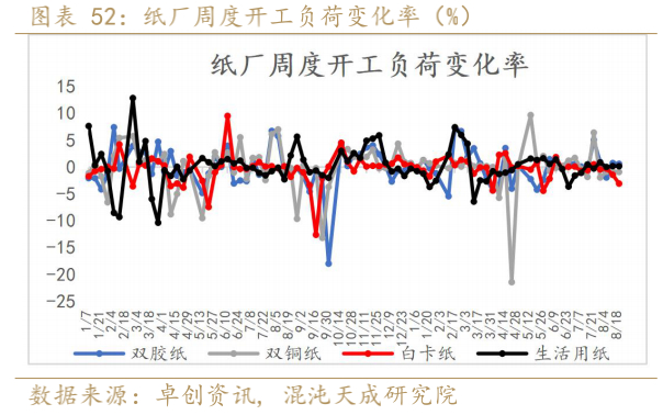 产能利用率方面,本周生活用纸开工负荷增加明显,其余纸种开工均明显下滑。