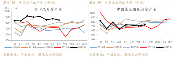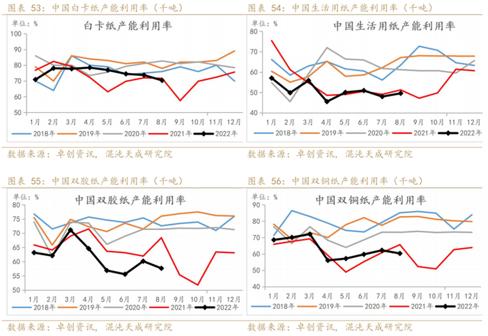月度数据上看,8月生活用纸产能利用率有所上涨,白卡纸和文化用纸产能利用率环比有所下滑。
