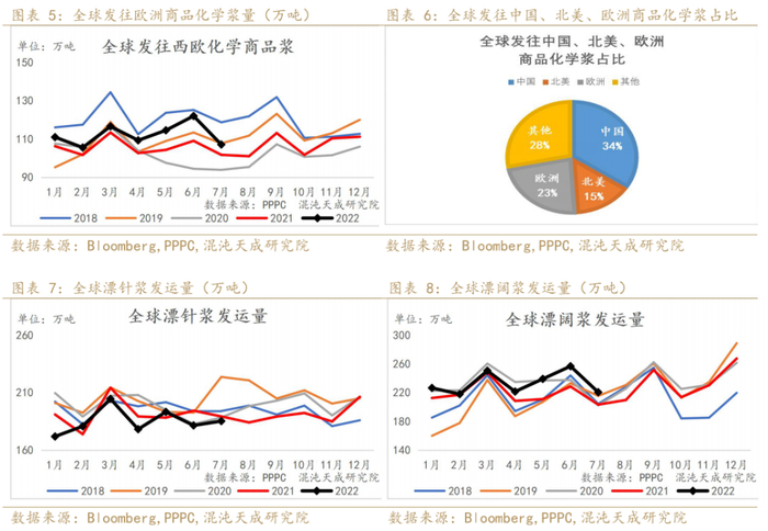 2022 年 7 月全球纸浆发运量环比下滑,同比高于去年;7月美国、欧洲发运量环比降幅明显,发往中国仍持平于去年。