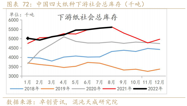 22年8月国内下游纸总社会库存环比小幅增加,同比持平于去年。