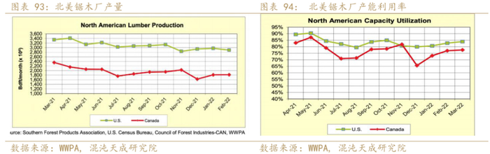 2022年3月,北美的木材产量环比继续增加,北美的锯木厂产能利用率继续回升。