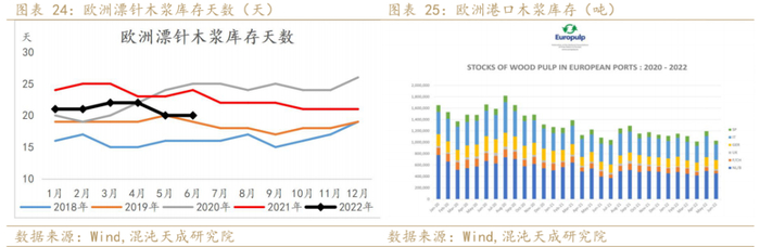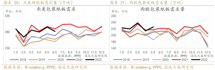 欧美疫情的放开,居民倾向于旅游,对于包装纸的需求有所下滑;北美包装纸需求连续4个月同比有所下滑,7月可能会下滑的更明显;西欧5月包装纸板需求仍处于高位,预计高通胀对需求端的影响逐步显现。