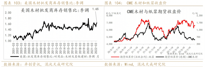 22年6月木材批发商库销比环比有所上升,木材期货价格近期持稳,木浆走势高位震荡。