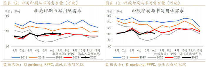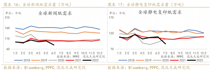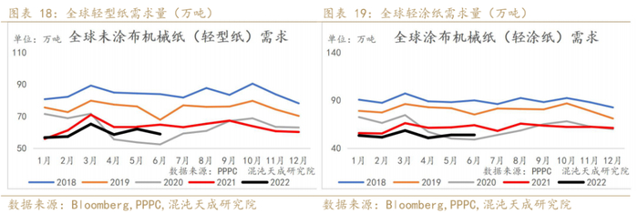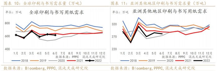 2022年6月全球印刷与书写需求环比有所下降,同比低于去年同期。