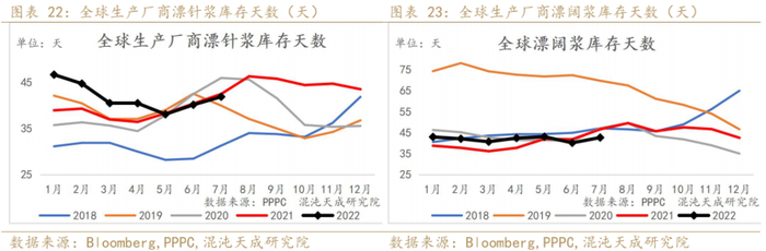 7月份漂针浆库存天数环比继续上升,库存压力有所增加;漂阔浆库存天数环比小幅增加,处于过去几年低位,预计与近期漂阔浆发运量增加有关。