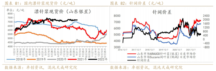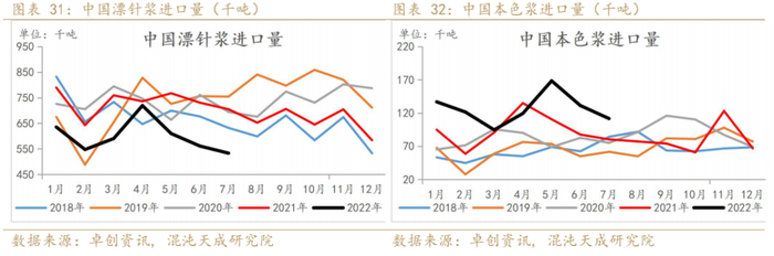 22年1-7月漂针浆进口量累计同比下降18%,7月进口量仍较低;本色浆累计同比增加34%,其中加拿大和俄罗斯浆厂转产本色浆后,出口至中国本色浆增加明显。