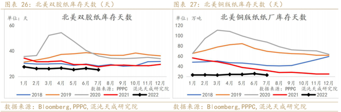 7月北美双胶纸和双铜纸库存天数环比小幅下滑,同比仍处于近几年低位。