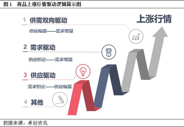 但实际上行情的上涨,并非只有需求推动才能成行,通常原料出现较长时间的上涨行情时,其背后一定有符合逻辑的强劲的驱动逻辑,而市场通常认为的炒作行情,在短周期内可能奏效,但长周期内必然无法持续。商品上涨行情的几种驱动逻辑简示图如下: