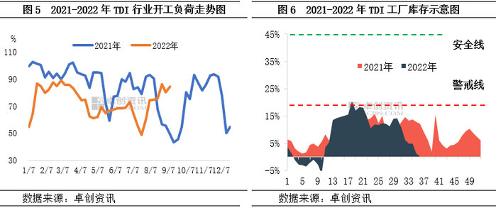 下图左为2021-2022年TDI行业开工负荷对比图,显而易见几乎全年低于2021年,而尤为重要的是,2022年国内TDI产能较上年减少8万吨,在产能减少的前提下,开工负荷降低,产出萎缩量不言而喻。实际上1-8月份中国TDI产量不足68万吨,较上年同期减少23%。