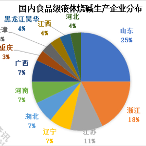 其中山东生产食品级液体烧碱的企业数量最多,目前省内有氯碱企业31家,其中有7家氯碱企业在产(分别是德州实华、大地盐化、东营赫邦、鲁泰化学、山东滨化、莘县华祥、寿光新龙)在产食品级液碱,占全国生产企业数量的25%。其中部分企业根据企业需求灵活调整生产,产量并不稳定,当地食品级液碱产量占企业生产总产量的 4%-8%不等。其它能够生产食品级液碱企业数量较多的省份分别是江苏、浙江、河南、湖北等地区。