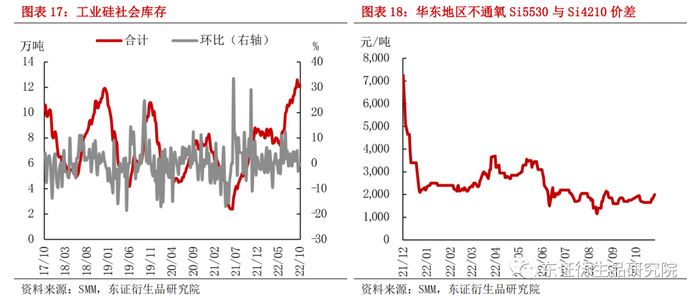 基于供需情况分析,预计11月份Si5530、Si4210价差有收缩趋势。从供应端看,不通氧Si5530主产地为四川、重庆、云南、陕西,前三者产量合计占比65%;Si4210主产地为新疆、云南、四川,川滇产量合计占比47%左右。11月枯水期来临后四川、重庆、云南产量受影响较大,且对于不通氧Si5530的边际影响大于Si4210。从需求端看,不通氧Si5530主要供给下游铝合金企业,而Si4210的下游需求主要是有机硅企业,目前多晶硅企业多使用99硅,仅少量使用Si5530和Si4210。我们对后续铝合金需求持中性看法,认为仍将维持较为稳定的采购量,但有机硅受终端房地产及消费品拖累明显,单体厂减产还会持续一段时间,对应Si4210的边际需求弱于不通氧Si5530。