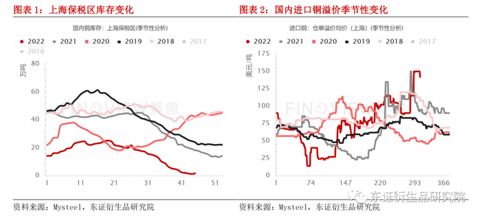 基本面角度看,市场对短期供需预期阶段偏强,由于供给扰动因素存在,冶炼产能利用率提升的节奏不及预期,疫情多地零散出现又对物流产生了阻碍,国内产出增长在市场端打折。当然,国内供应的核心问题还在于进口放缓。一方面,海外溢价受供应链风险及通胀传导影响,相对国内溢价更有经济性,另一方面,进出口贸易商资金链紧张,且非洲港口等物流存在阶段问题。这就造成进口铜流入保税区的速度放缓,从而导致保税区库存持续去化。