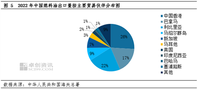 据国家海关数据统计,2022年1-9月中国出口燃料油贸易伙伴前五位分别为中国香港、利比里亚、巴拿马、马绍尔群岛和新加坡。其出口量分别为383.03万吨、333.73吨、260.11万吨、129.78万吨和108.74万吨。