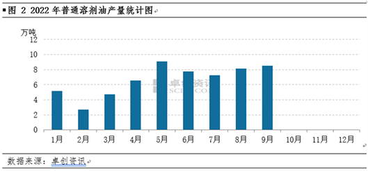 据卓创资讯统计,2022年1-9月国内普通溶剂油产量为59.825万吨,同比减少16.765万吨,降幅21.89%。2022年普通溶剂油单月产量基本维持在5-9万吨,导致2022年产量下降的主要原因有:部分时间段原料石脑油资源紧缺,厂家受限于原料采购问题,装置不得已停工;年内石脑油价格偏高,厂家利润欠佳,部分厂家选择停工规避风险;春节及大型赛事影响,部分厂家装置长期停工;需求面偏弱,厂家出货压力较大情况下,多降低负荷灵活生产。