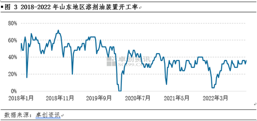 一季度,受原料价格高位、春节假期等因素影响,国内溶剂油装置开工率持续低位运行。据卓创资讯数据显示,2022年一季度溶剂油平均开工率为15%,较2021年四季度下降22个百分点,且春节期间开工率仅为4%,为年内最低点。二季度,随着下游企业需求的提升,市场短期出现资源紧张的情况,市场价格也涨至高位,厂家利润情况有所改善,故二季度山东地区溶剂油装置开工率出现明显回升,维持在30%左右。三季度,7-8月份国内大部分地区为高温多雨天气,下游企业开工率不足,为溶剂油传统需求淡季。且9月份出现旺季不旺的现象,下游需求不及往年同期,故溶剂油装置停工较多,甚至出现长期停工的现象,开工率略有下滑。