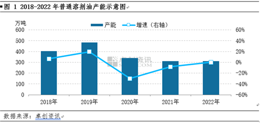 2018-2022年,国内普通溶剂油产能整体呈先增后减的趋势,2020年开始普通溶剂油产能下滑明显。主要是因为前期快速增长的产能无法全面释放,溶剂油产能利用率偏低,甚至部分炼厂长期处于停工状态,故部分厂家退出溶剂油舞台。