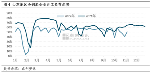 图4为卓创资讯监测的26家山东地区全钢胎样本企业的开工负荷走势,其在10月后的开工负荷偏低,截止到11月15日,近一个半月的平均开工负荷为47.9%。轮胎企业的低开工负荷拉低了防老剂RD的整体需求。