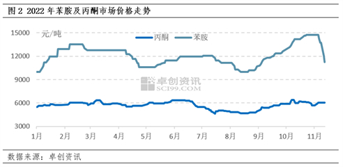 图1显示,防老剂RD市场价格在9月6日开始触底反弹,截止到11月9日,华北地区RD的价格最高涨至15550元/吨,累计涨幅为38.2%。11月10日开始价格进入下跌通道,截止到11月15日,短短的5天时间,价格累计跌幅便达到8.4%,价格跌回至9月底的水平。此次防老剂RD价格下滑受多方面因素影响,其中成本面及供需面是主要的影响因素。
