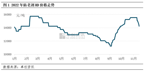 【导语】 11月上旬,防老剂RD价格进入下滑通道,仅短短数天,价格已跌至9月底的水平。此次防老剂RD价格下滑受多方面因素影响,其中原料苯胺等价格下滑利空及需求面偏弱引起的供需错配是主要的影响因素。短期看防老剂RD价格仍存下滑可能。
