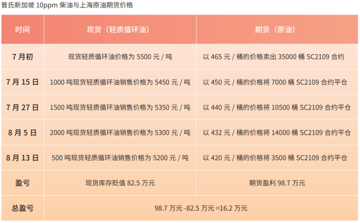 华南油贸商经过与方正中期进行多轮交流后,接受了套期保值操作方案。此后,由于国际原油价格如预期回调,国内轻质循环油进口到岸价也出现下跌,企业库存出现贬值,至8月中旬,企业库存货品全部出库结算。尽管企业现货销售亏损82.5万元,但通过参与期货套期保值盈利98.7万元,弥补了现货销售亏损,最终净盈利16.2万元,实现了风险对冲管理。具体盈亏如下表: