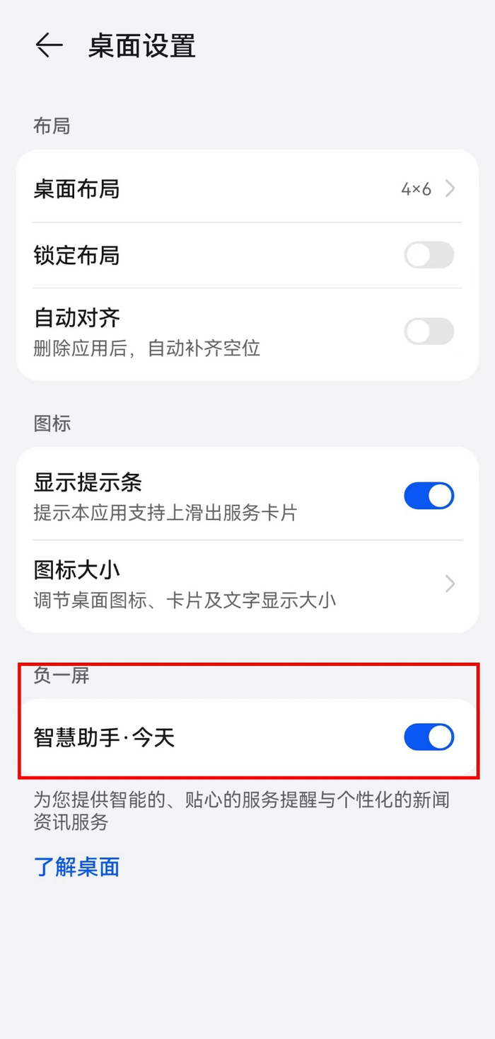 打开华为手机负一屏的功能:桌面主屏幕双指捏合后点击桌面设置,进入设置界面后开启"智慧助手·今天功能"。