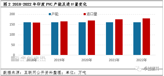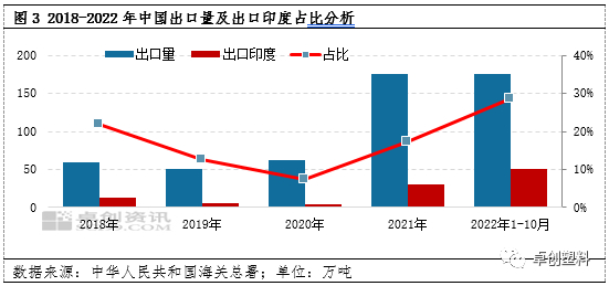 印度之前一直对中国实施反倾销措施,所以中国出口到印度的量相对偏低。2021年PVC粉出口总量及出口印度的量增加均较为明显,主要是因为2月中旬美国遭遇极端寒潮,导致美国近半数PVC粉装置意外停车,国际货源紧缺,给中国出口带来机会,8月美国又遭遇飓风影响,部分PVC粉装置再度遭遇不可抗力,推动国内PVC粉出口量再度增加。2022年中国出口印度的量继续提升,主要是因为2022年1月印度对中国PVC粉反倾销政策到期,在新政策出台之前,印度对中国不收取进口反倾销税,印度国内企业加大力度采购价格低廉的中国电石法PVC粉,所以2022年中国出口到印度的PVC粉数量大幅增加,由此也带动中国PVC粉出口量再创新高。