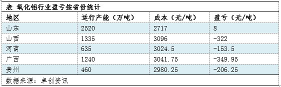 根据卓创资讯调研统计,2022年11月中国氧化铝行业平均亏损较上月减少,平均亏损168.47元/吨,较10月份亏损221.51元/吨减少53.04元/吨。分区域来看,五个重点监测区域中仅山东氧化铝生产处于微利状态,具体情况参考下表: