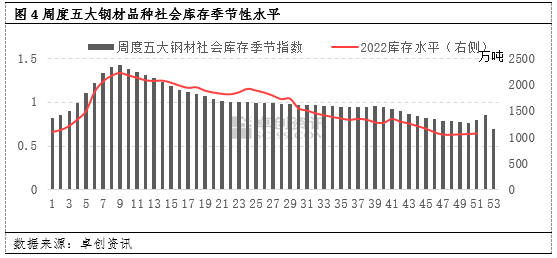 五大钢材品种社会库存季节性指数来看,1-4周低于1且库存水平逐渐推升,23-53周低于1且库存水平持续下降。而5-22周则高于1且库存水平呈现先增后降的趋势。当季节性指数低于1反映出库存有缺口出现,市场交易活跃度变化较大。