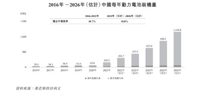 鉴于下游电动汽车需求的增加,全球及中国动力电池市场面临了强劲的增长,且预计近期将持续强劲的涨势。根据弗若斯特沙利文的资料,全球每年动力电池的装机量自2016年的41.2GWh增加至2021年的293.7GWh,复合年增长率为48.1%,并预期将进一步增长至2026年的1,845.2GWh,2022年至2026年间的复合年增长率为39.1%。