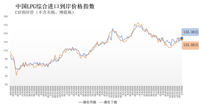 2022年12月26日-2023年1月1日中国液化丙烷、丁烷综合进口到岸价格指数为133.30点、133.00点