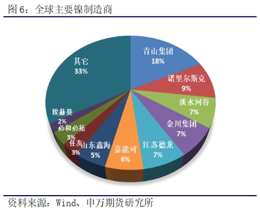 全球主流的镍制造商,以前主要由海外跨国公司主导,包括俄罗斯诺里尔斯克、淡水河谷、嘉能可、必和必拓、英美资源等企业。近年来,随着我国镍产业龙头企业在印尼的产能突破,逐步打破了镍产品市场的垄断。目前,全球镍供应格局已经逐步形成海内外龙头企业并存的格局,以青山集团、金川集团、江苏德龙等为代表的中国镍制造商逐鹿东南亚,其中青山集团更是已18%市场份额拔得头筹,呈现出后来居上的态势。